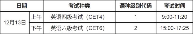 英语四级口试(CET-SET4)考试时间为11月22日,英语六级口试(CET-SET6)考试时间为11月23日。具体场次安排如下: